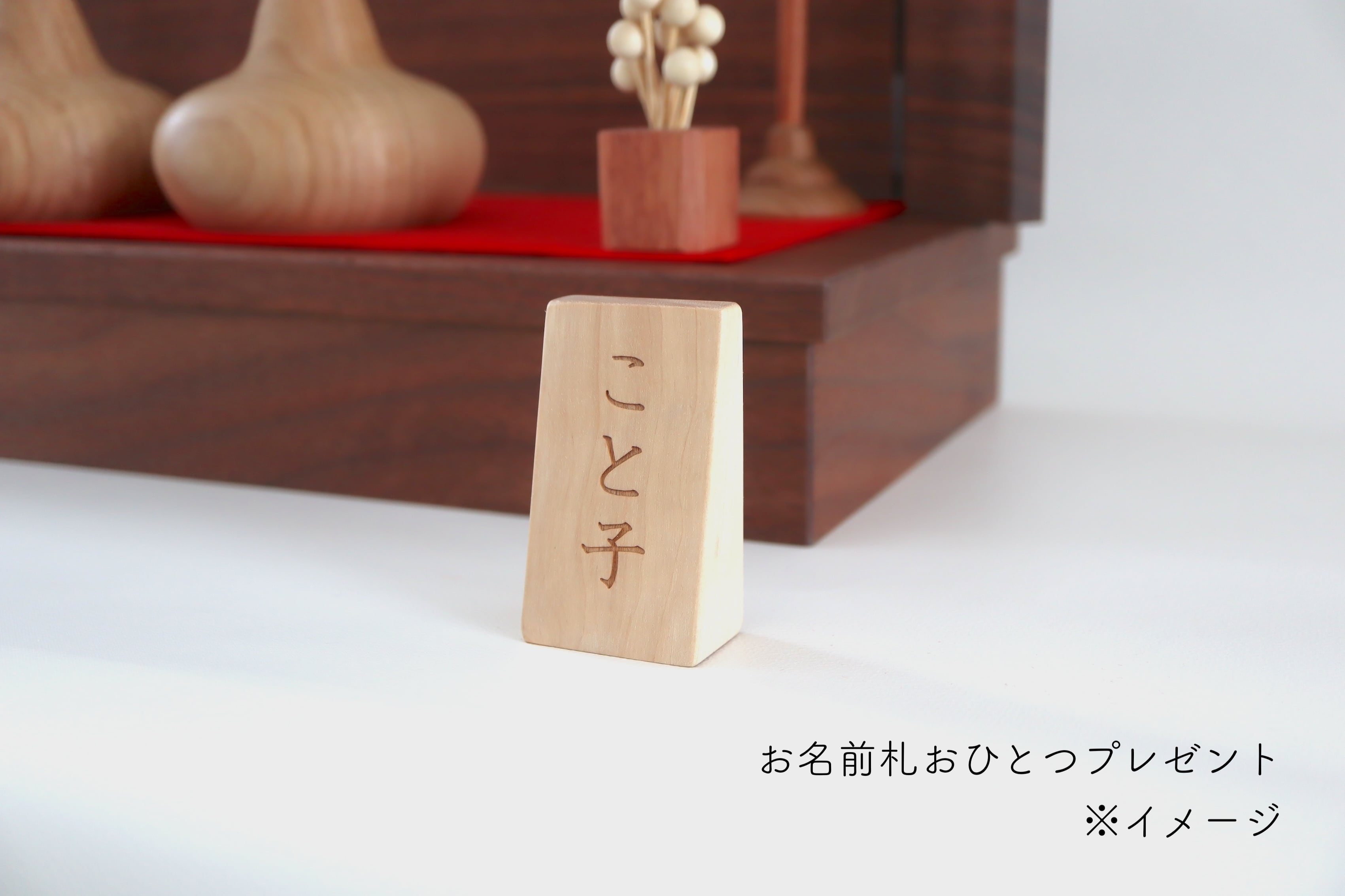 また、ご購入の方へお名前札をおひとつプレゼントしております。ご希望の方はオプション選択にてご希望のお名前をお知らせください。ご注文後当店より原稿確認のメールをさせていただきご了承後1週間ほどで完成予定ですので、お雛様に同梱し出荷いたします。