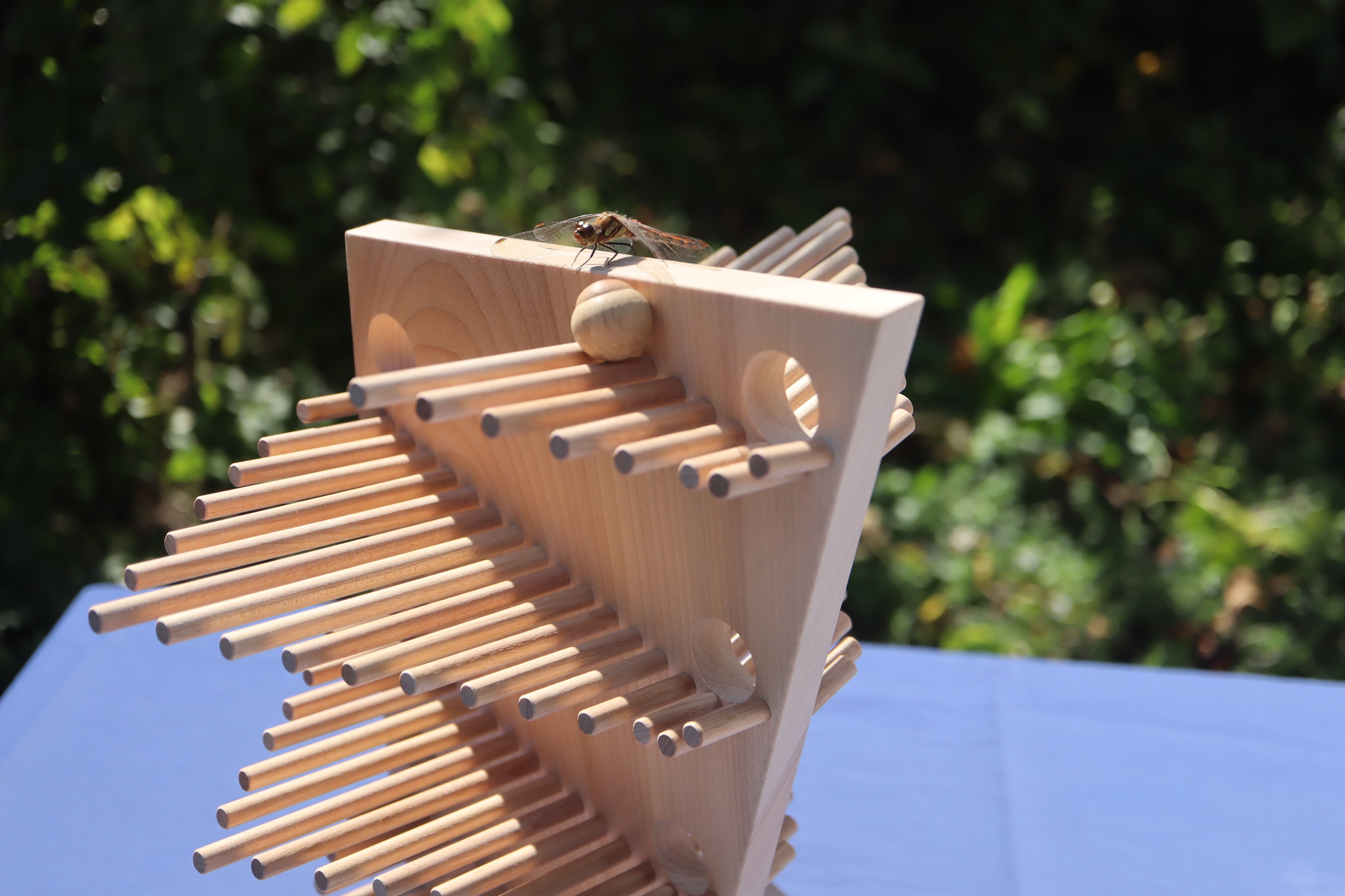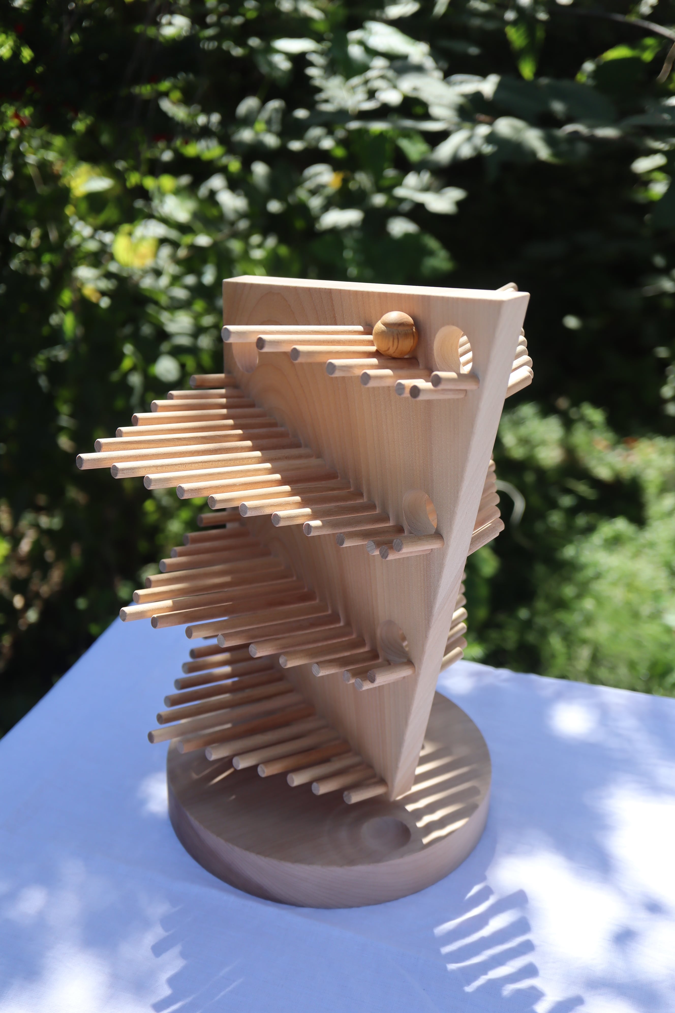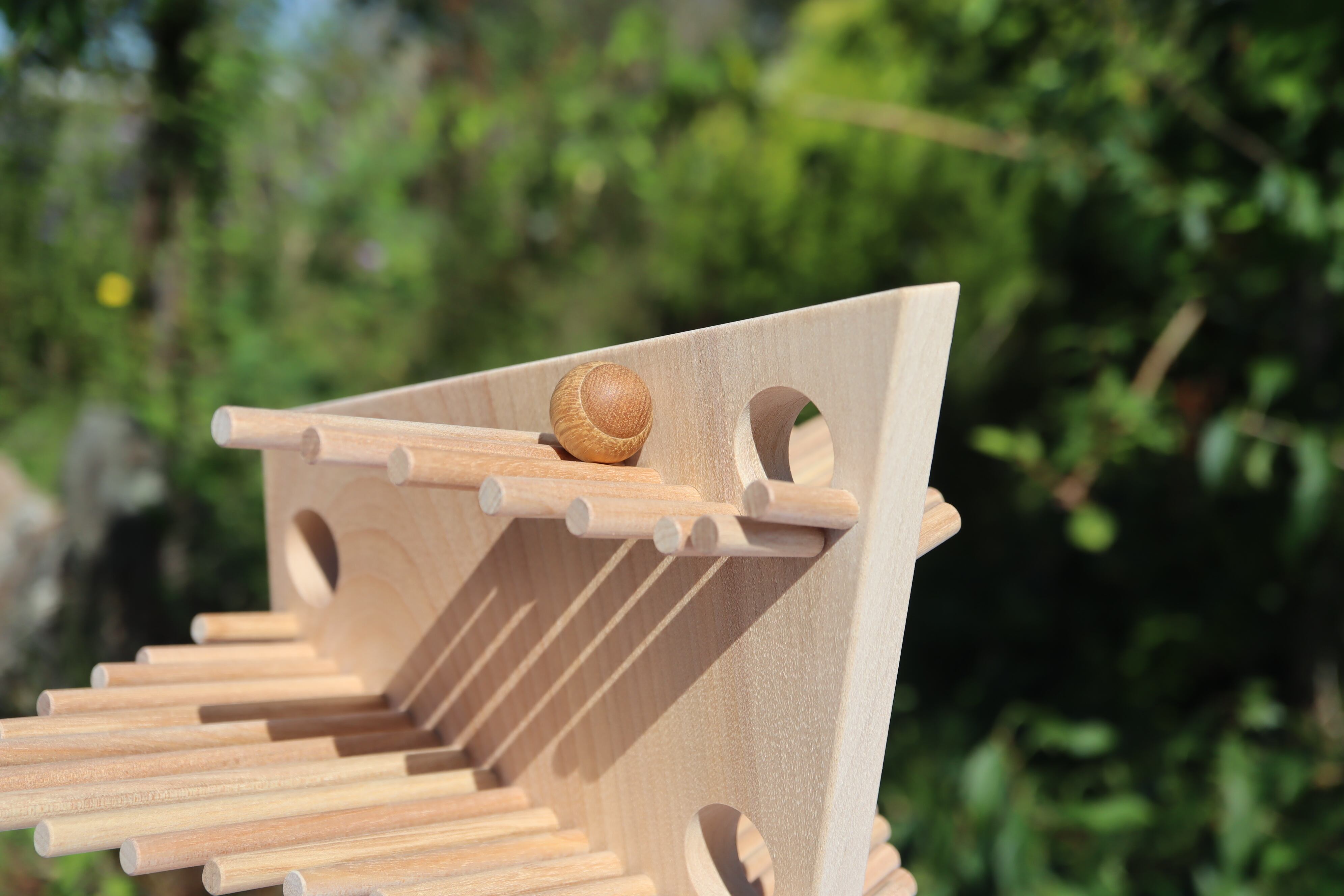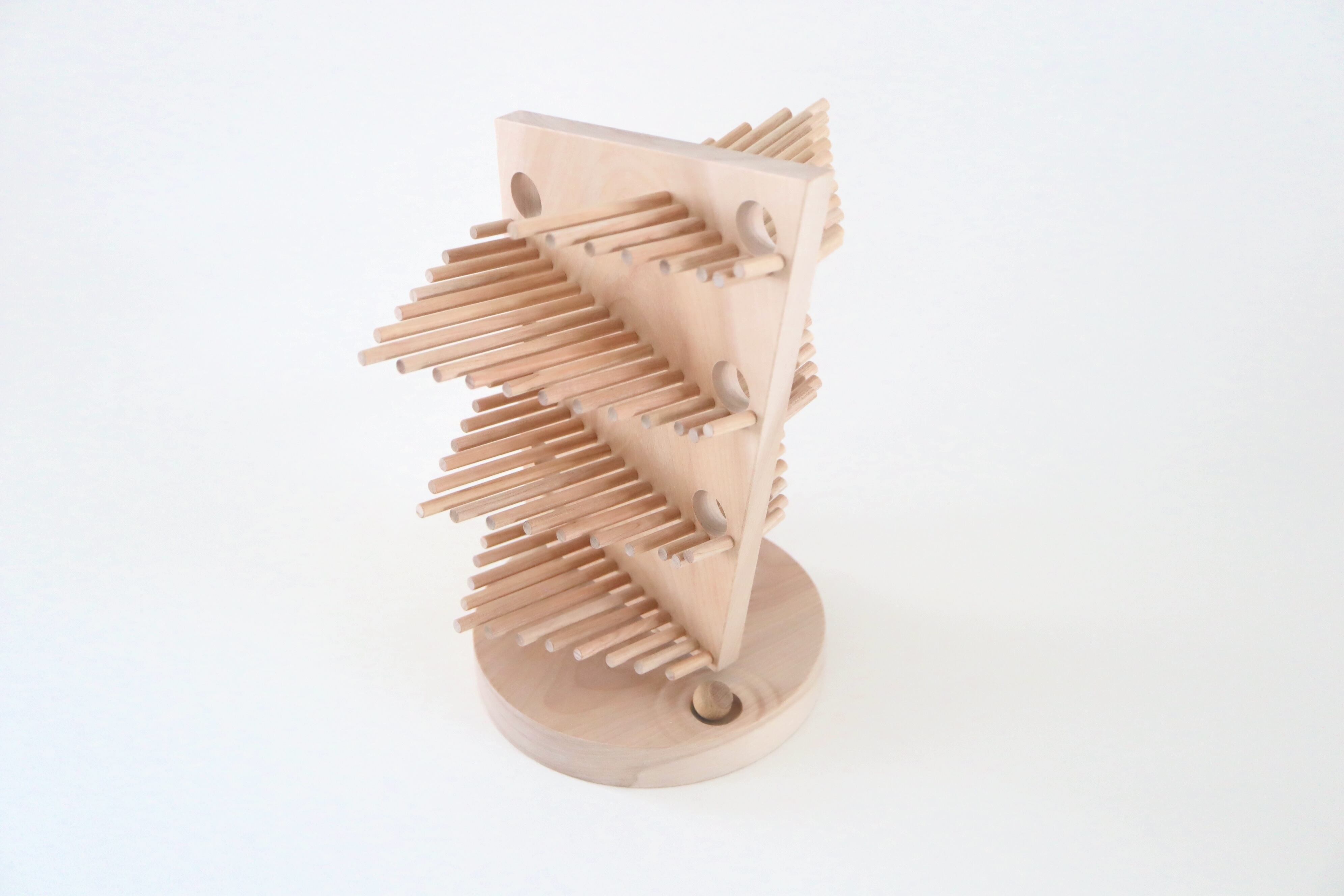 上から木の実(玉)を転がすと心地よい音を響かせる作品です。終着点は木の実が水面に落ち波紋が広がっていく様子を表現しています。