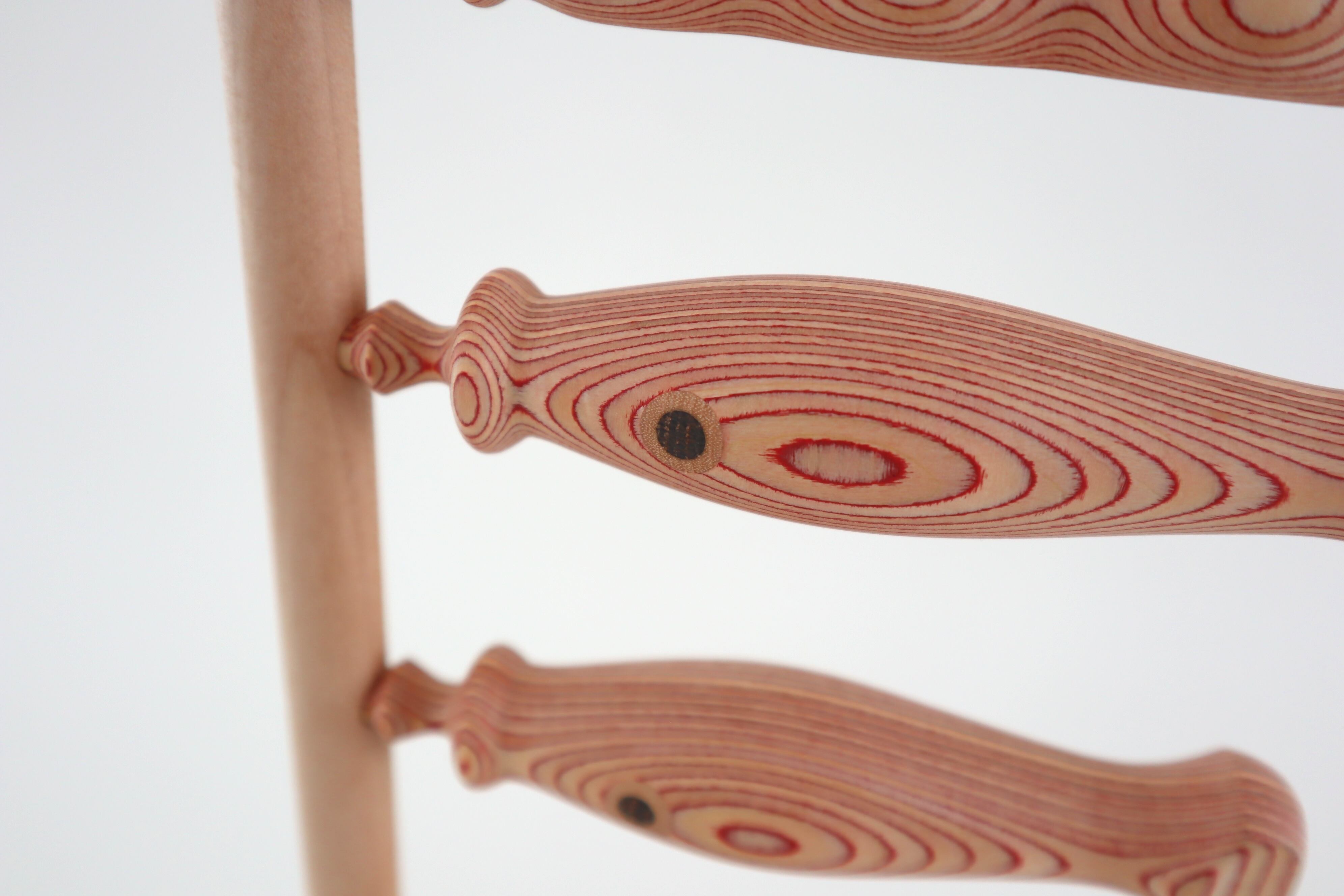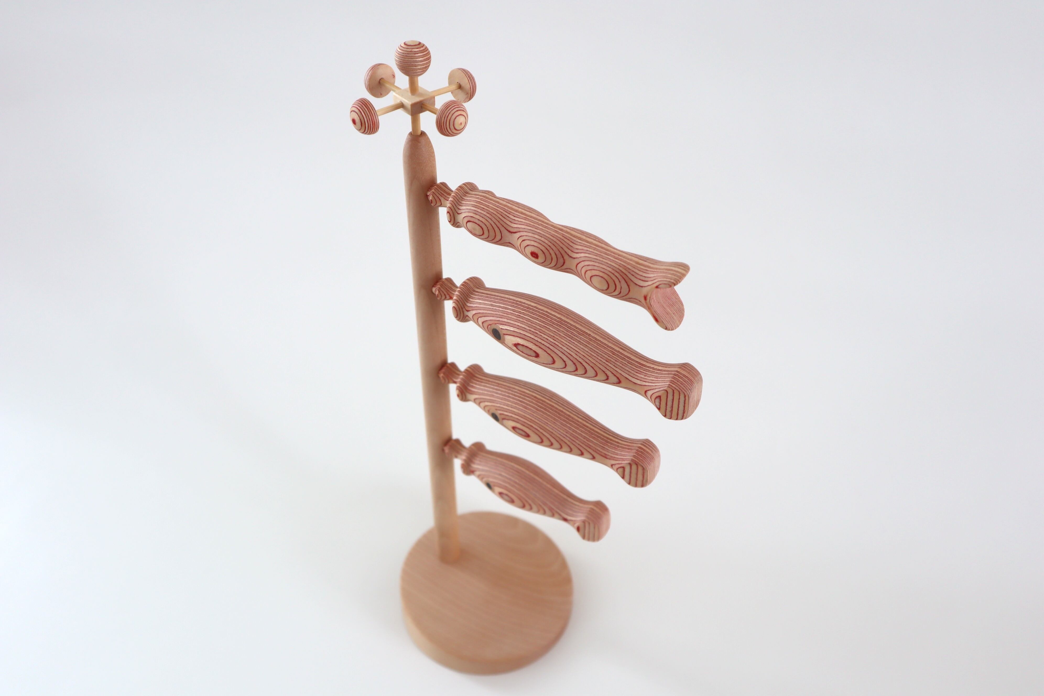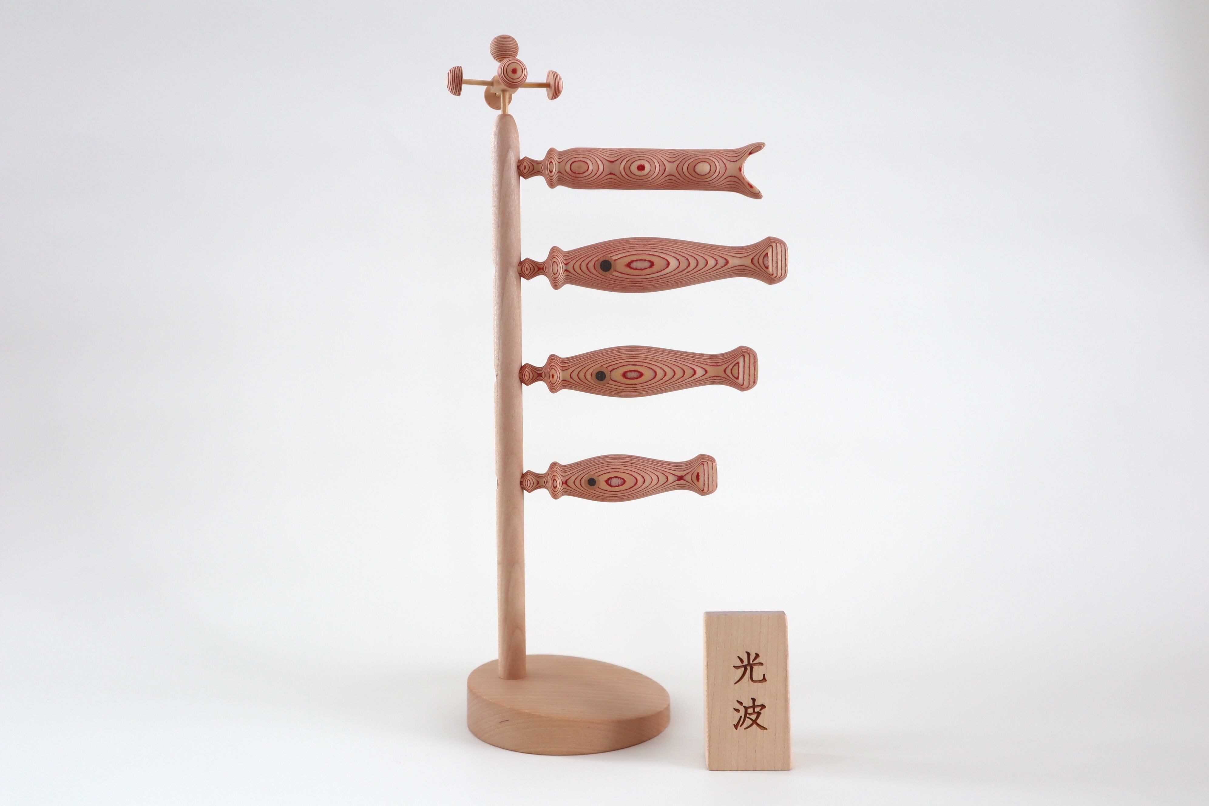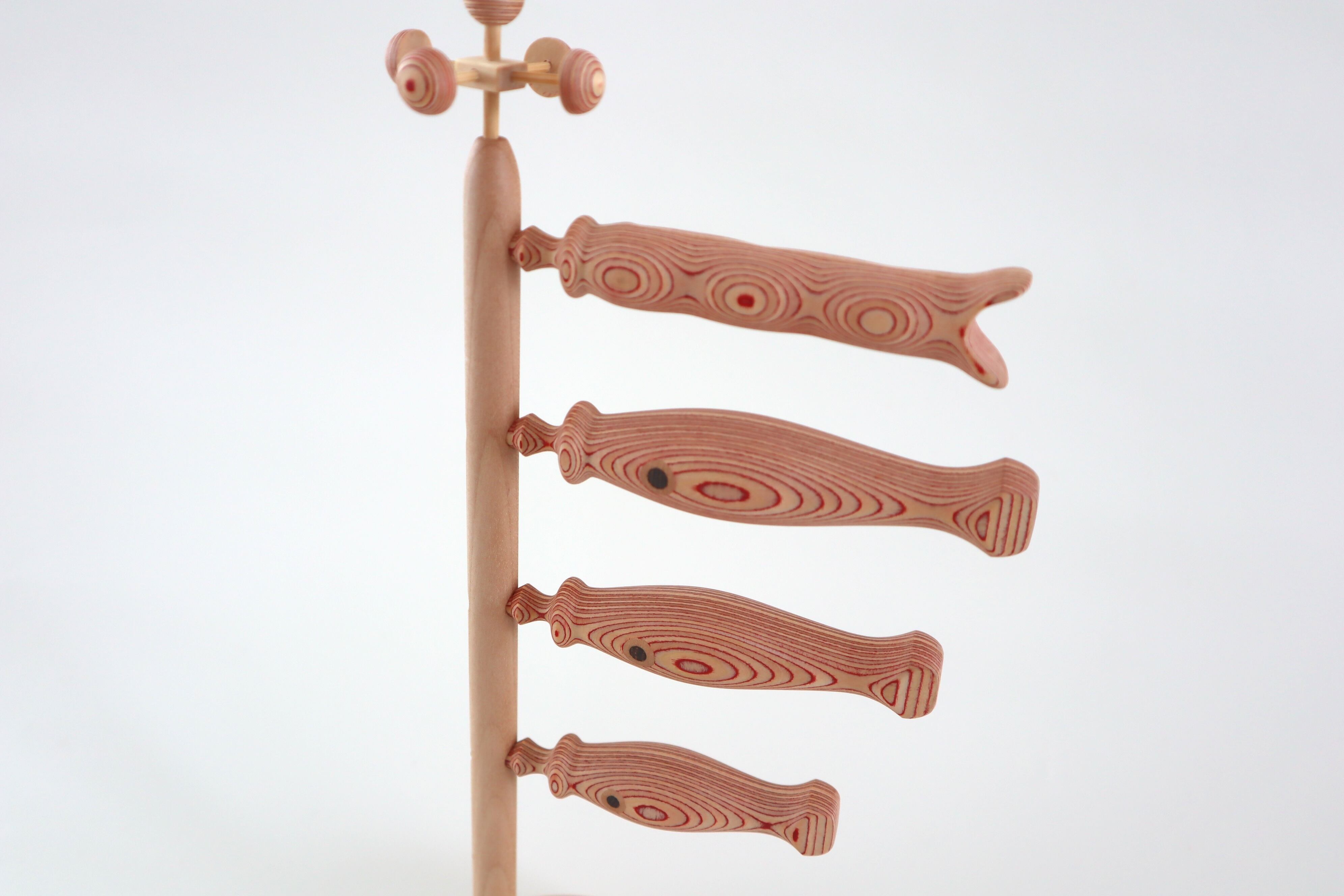 赤い色を付けた木を貼り合わせ鯉の形に削り出しているため、うろこのような面白い模様が浮き出ています。