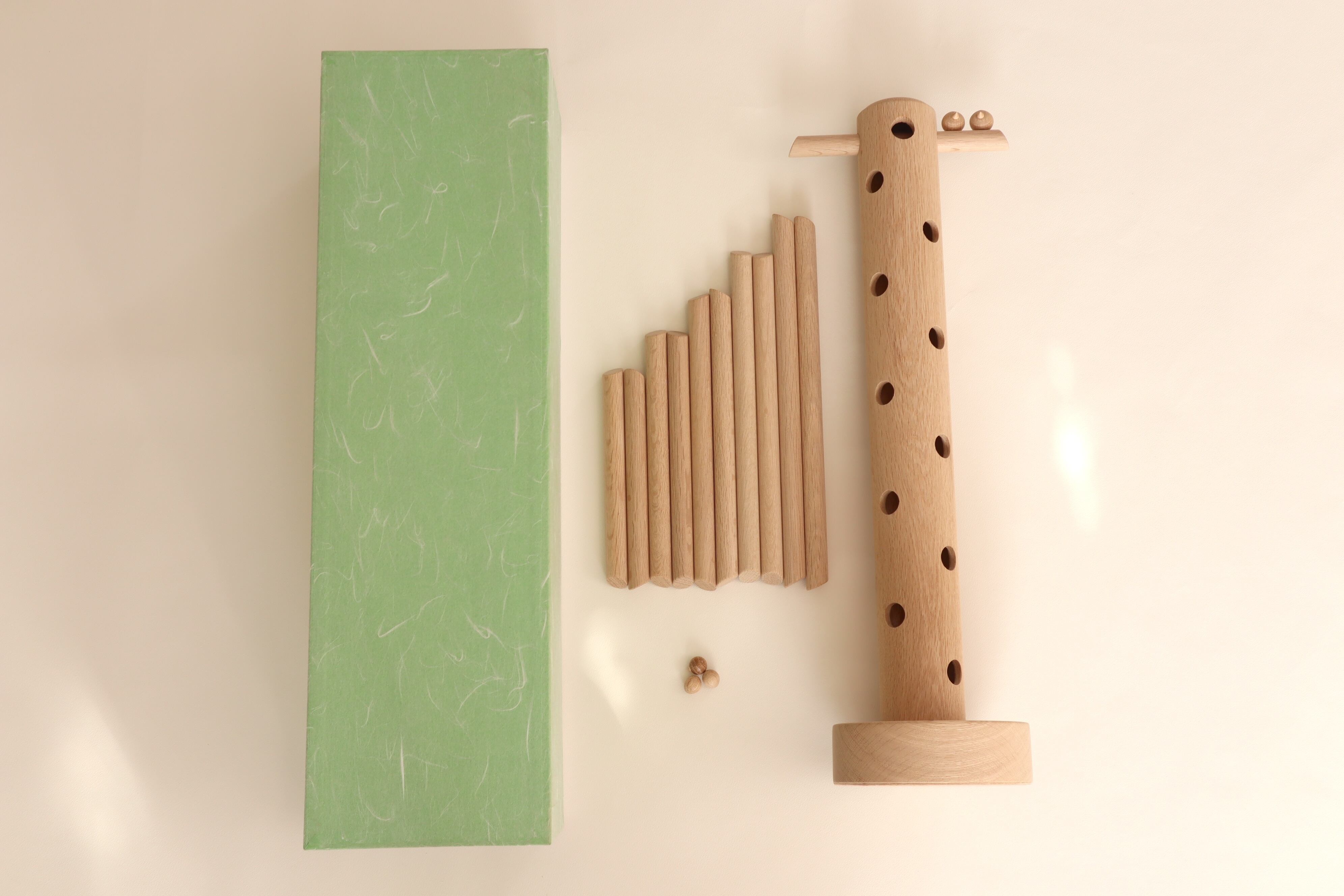 小さな小鳥とタマゴを上の穴から入れると筒の中で木の棒にあたりチロチロチロ…と、まるで小鳥がさえずっているような音色を奏でます。雛鳥と、まだタマゴの兄弟たちが巣から飛び出し冒険に出かけ、その様子を木の枝の上から親鳥が見守っているイメージです。